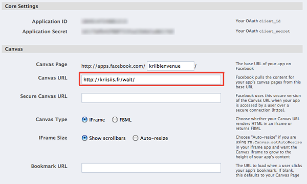 Juste en dessous de cette Canvas Page, Facebook vous demande de définir la « Canvas URL ». Concrètement, il s’agit du chemin menant vers le document que vous hébergez. J’ai passé un certain temps à chercher ce qui était vraiment demandé, alors je vais faire simple : en supposant que l’Iframe souhaitée soit une retranscription d’un document nommé « landing.html » dont l’adresse est http://kriisiis.fr/wait/landing.html, alors la Canvas URL est http://kriisiis.fr/wait/ (avec le / !).