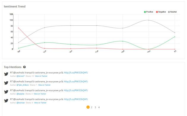 Coup de coeur sur les fonctionnalités e-reputationnelles ! Il est possible d’effectuer des recherches « flash » sur des hashtags propulsés à la fois sur Twitter, Google + et Instagram et d’en extraire des reportings pour évaluer la pertinence et les scores de visibilité de ceux-ci, mais également d’analyser le sentiment des interactions avec la communauté d’une marque : on peut en effet vérifier et agir sur les tonalités positives ou négatives, déterminées par un algorithme interne, et « scanner » près de 50 millions de pages piochées dans des forums, des sites ou des blogs jugés pertinents, ce qui est plutôt nouveau sur un outil de multi-publishing.