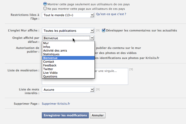 Afin que cet onglet soit affiché automatiquement lorsqu’un « non-fan » se rend sur votre page (cela ne concerne donc que les onglets de type « Bienvenue », par exemple), cliquez sur « Modifier la Page » en haut à droite de votre Fan-Page, puis sur « Gérer les permissions » (normalement affiché par défaut), et renseignez « l’onglet affiché par défaut ». Cliquez sur « Enregistrer les modifications », et le tour est joué ! Votre page d’atterrissage est désormais effective.