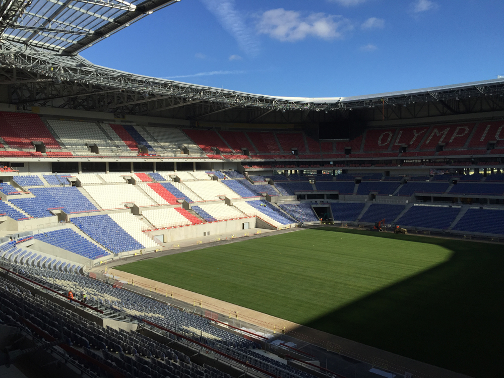 Mardi 10 novembre, à peine remis de l’adrénaline accumulée pendant le derby de l’avant-veille, j’ai eu l’occasion de faire quelque chose que j’attends depuis longtemps : visiter le futur Grand Stade de l’OL. Il faut dire qu’avec de la famille à Décines, commune accueillant ce géant ayant nécessité l’équivalent de tout le béton coulé pendant un an dans l’agglomération lyonnaise et dont la charpente fait le poids de la Tour Eiffel (400.000 boulons compris), j’ai souvent l’occasion de passer devant, et donc de suivre la progression des travaux qui ont débuté il y a « seulement » 29 mois. Et le résultat est, très honnêtement, à la hauteur de mes espérances : le Grand Stade, dont l’architecte est le même que pour l’Emirates Stadium d’Arsenal en Angleterre, est un « stade à l’anglaise », bluffant par sa taille, son design, son agencement, et surtout, par sa capacité à ne pas présenter le moindre poteau à l’intérieur –si ce n’est ceux des buts– afin de s’assurer que jamais, ô grand jamais, un spectateur ne sera gêné par un élément dérangeant dans son champ de vision.
