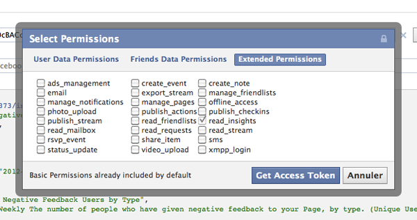 Dans l’Explorer, cliquez sur « Obtenir le jeton d’accès » (un système permettant de contrôler l’accès aux objets soumis à des règles et de s’assurer que l’utilisateur est habilité à effectuer certaines opérations), cliquez sur l’onglet « Extended Permissions » et assurez-vous que la case « read_insights » est cochée. Lorsque c’est fait, cliquez sur « Get Access Token », ne paniquez pas lorsque la fenêtre de permissions s’ouvre puis se referme, et vous voilà prêt pour la troisième étape !