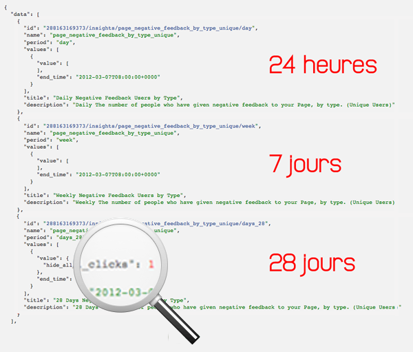 La ligne « hide_clicks » présente le nombre de fois où une publication a été masquée depuis le flux d’actualité, la ligne « hide_all_clicks », le nombre de fois où l’ensemble des publications ont été masquées (action que vous pouvez interpréter comme un « Je n’aime plus », entre nous), « unlike_page_clicks » le nombre de désabonnements (les vrais « Je n’aime plus ») et enfin, « report_spam_clicks », le nombre de fois où vous avez été signalé auprès de Facebook par un ou plusieurs utilisateurs.