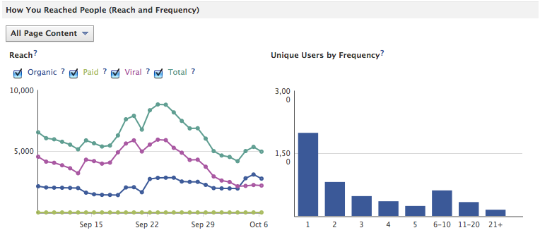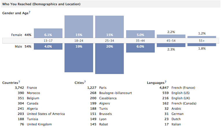 La première moitié de cette page ressemble à s’y méprendre à celle de l’onglet dédié aux fans, si ce n’est que les données sont légèrement différentes puisqu’elles concernent cette fois-ci spécifiquement les personnes que vous avez pu atteindre via votre activité : en d’autres termes, toute personne ayant pu voir votre contenu ou le nom de votre Fan-Page sur Facebook, fans comme non fans (un non fan pouvant visualiser une publicité ou un contenu relayé par un fan, par exemple).