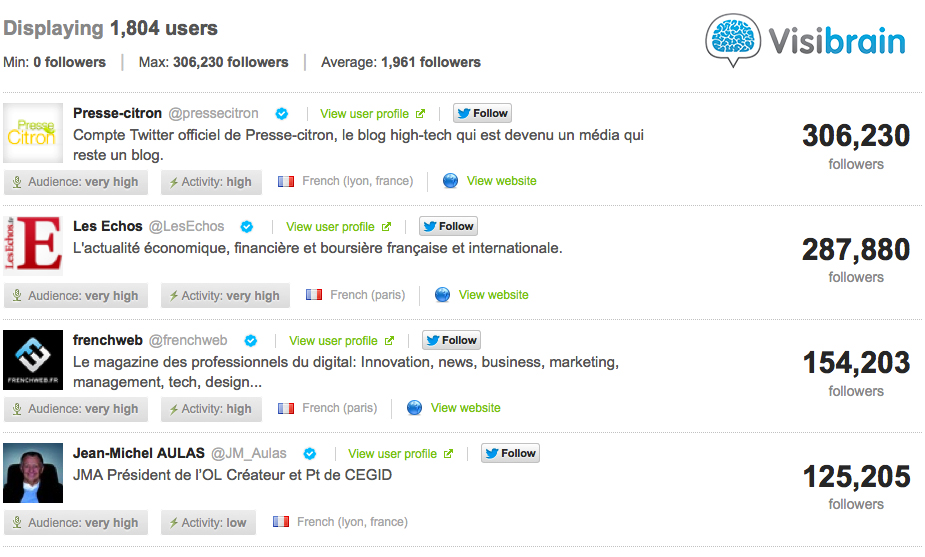 À l’origine de l’ensemble de ces tweets, ce sont très précisément 1.804 utilisateurs de Twitter qui ont dégainé leur smartphone, ordinateur ou autre Google Glass. Des comptes très populaires étaient au rendez-vous, avec notamment @PresseCitron (306.230 abonnés), @LesEchos (287.880 abonnés), @FrenchWeb (154.302 abonnés), @JM_Aulas (125.205 abonnés) ou encore @LDLC (90.399 abonnés) et @Orange (88.422 abonnés) pour ne citer qu’eux, qui ont su faire de ce « Day 1 » l’une des tendances les plus populaires sur Twitter aujourd’hui.