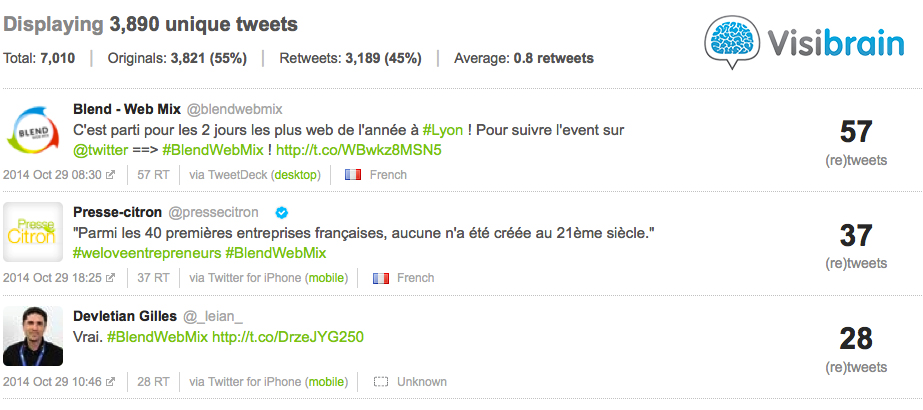 Avant toute chose, parlons « nombre de tweets ». Ce jour, 7.010 tweets concernant le Blend Web Mix qui ont été publiés (3.821 tweets engendrant 3.189 retweets), dont 6.430 contenant le hashtag #BlendWebMix. Le record est de 950 tweets en une heure, le matin entre 10 et 11 heures, tranche couplant à la fois la plénière d’ouverture et certaines conférences très attendues.