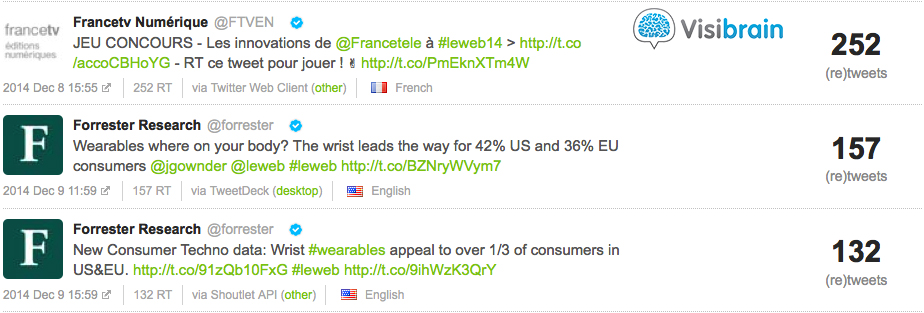 Quels sont les tweets qui ont suscité le plus de retweets ? Le premier est un jeu concours de France Télévisions, suivi par deux tweets d’un compte qui a engrangé beaucoup de visibilité sur l’évènement, à savoir @Forrester (@Frenchweb se positionne bien également en occupant la 5ème et la 6ème place) :
