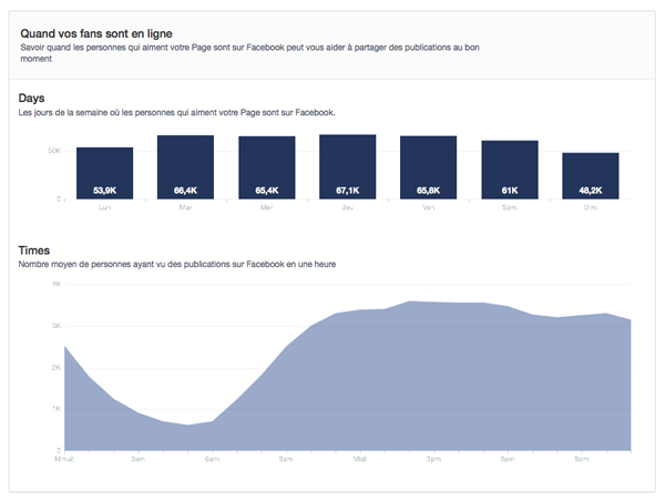 « Quand vos fans sont en ligne » est mon gros coup de cœur de ces nouvelles statistiques. Très simple, ce sous-onglet présente clairement les dates et les horaires auxquels nos fans sont les plus actifs sur Facebook. De quoi simplifier la tâche à de nombreux community managers qui se souciaient encore trop peu des horaires idéaux dans leur propre cas de figure (car pour rappel, aucune communauté n’est identique, et chaque typologie d’internaute à ses propres habitudes d’utilisation).