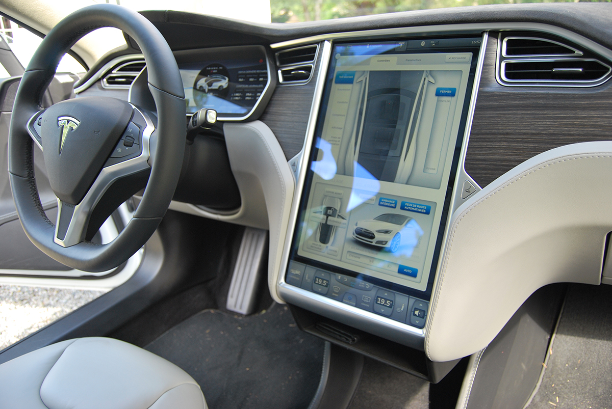 Concernant l’écran tactile, car je sais bien que c’est l’un des éléments qui fait le plus parler dans mon entourage, l’expérience est conforme à mes attentes : le tactile se rapproche des ordinateurs de bord classiques, mais ses dimensions pharamineuses (17 pouces) font penser que l’on a collé deux ipad l’un au dessus de l’autre, ce qui est le summum en terme de confort. La navigation est simple et efficace, les catégories telles que « Multimédia », « Navigation », « Agenda », « Téléphone » ou encore « Énergie » sont complètes et intuitives et peuvent être combinées simultanément (par exemple : une playlist audio sur la partie supérieure de l’écran, la carte avec trajet pour se rendre au superchargeur le plus proche sur la partie inférieure). Le cadran derrière le volant est également un bel écran ; j’ai d’ailleurs été bluffé par son ergonomie, son design et par l’affichage de la route à suivre (GPS), d’une clarté et praticité rares.