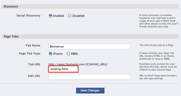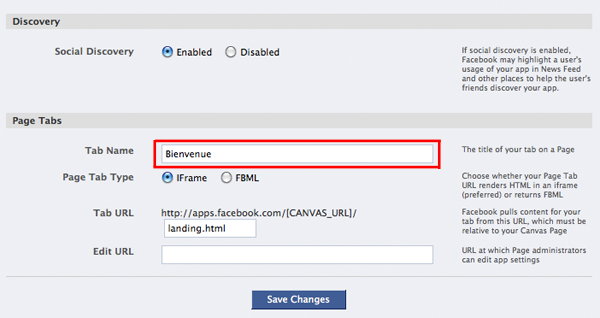 N’accordez pas d’intérêt au « Secure Canvas URL » ainsi qu’aux réglages suivants (pensez tout de même à indiquer « Iframe » pour ce qui est du « Canvas Type ») et passez directement au « Tab Name » en bas de page. Il s’agit du nom qui sera marqué sur l’onglet situé en dessous de l’avatar de votre Fan-Page, à côté du logo que vous avez sélectionné lors de l’étape 3. Je vous suggère un nom en un seul mot (« Bienvenue », par exemple), mais vous n’êtes pas limité en nombre de caractères.