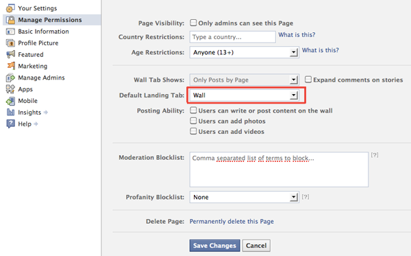 Cette application pourrait avoir vocation à devenir votre Landing App, c’est à dire la page sur laquelle les non-fans (de votre Fan-Page) atterriront lors de leur visite. Pour ce faire, cliquez sur « Edit Page », rendez-vous dans l’onglet « Manage Permissions » et définissez la « Default Landing Tab », c’est à dire la page d’atterrissage. Pour terminer, utilisez un autre compte (non-membre de la Fan-Page) ou déconnectez-vous afin de vérifier que tout fonctionne correctement.