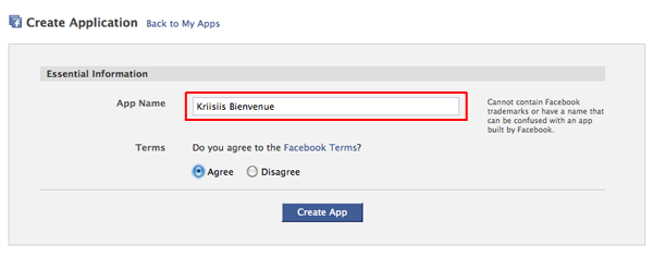 Facebook vous demande alors de nommer votre application. Sachez que ce nom n’a aucune incidence, il ne sera pas marqué sur votre Fan-Page et ne servira qu’à l’administrateur (c’est à dire vous, dans le cas présent), afin qu’il puisse se rappeler de sa fonction lors d’une future visite de facebook.com/developers. Sachez seulement que ce nom ne peut pas comprendre le terme Facebook on ne serait-ce que ressembler à un nom d’application proposée par Facebook.