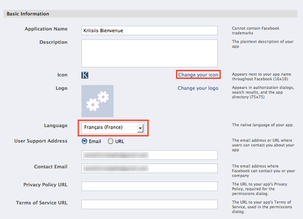 Si vous souhaitez paraître professionnel, ne négligez surtout pas cette étape. Après la sélection d’une description (que vous pouvez laisser vide) et celle de la langue de l’application, Facebook vous propose de définir le logo de votre App (et donc de votre onglet, sous votre avatar de Fan-Page). Attention, le logo (en 16×16 pixels) est ici nommé « icône », alors que le bloc « logo » est en fait le logo de l’application, absolument inutile dans notre cas. Ne confondez pas !