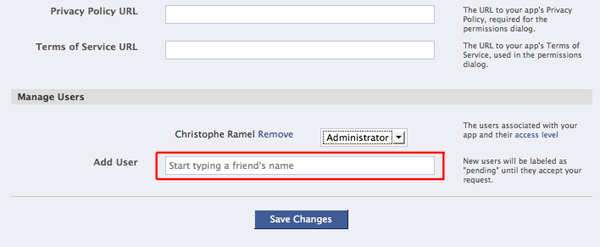 En bas de cette même page, il vous est possible de définir un ou plusieurs administrateurs pour votre application. Sachez que cela n’a pas de rapport avec le paramétrage sur la Fan-Page, il s’agit ici des membres de Facebook qui pourront modifier l’application (et non son contenu, qui je vous le rappelle, sera retranscrit via une Iframe) et qui auront accès à ses chiffres (nombre total d’utilisateurs, nombre d’utilisateurs récents, personnes ayant liké l’application).