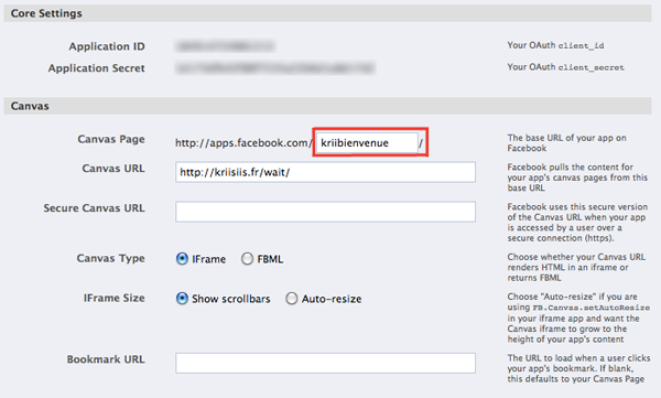 Juste en dessous de cette Canvas Page, Facebook vous demande de définir la « Canvas URL ». Concrètement, il s’agit du chemin menant vers le document que vous hébergez. J’ai passé un certain temps à chercher ce qui était vraiment demandé, alors je vais faire simple : en supposant que l’Iframe souhaitée soit une retranscription d’un document nommé « landing.html » dont l’adresse est http://kriisiis.fr/wait/landing.html, alors la Canvas URL est http://kriisiis.fr/wait/ (avec le / !).