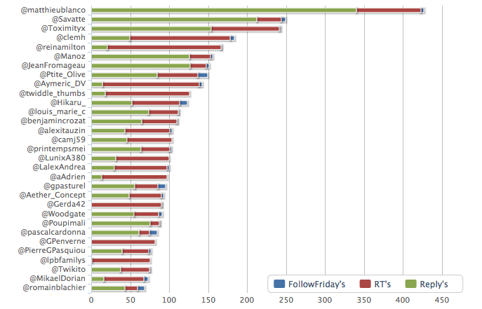 Comment obtenir cet indicateur : ce deuxième indicateur peut également être obtenu à l’aide de Twoolr, notre outil français présenté dans le premier point. Pour cela, rendez-vous simplement dans la catégorie « Usage », et visionnez le second graphique nommé « Distribution ». Il vous permettra d’ailleurs d’obtenir votre part de recommandations, c’est à dire votre part de Follow Fridays, et de vérifier que votre distribution n’évolue pas trop (si celle-ci est rodée) au fil des jours, des semaines ou des mois.