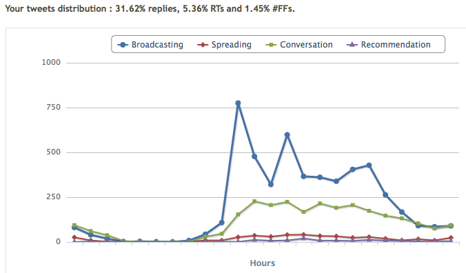 Il n’est pas impossible que vous souhaitiez jouer un rôle spécifique sur Twitter, celui de « relayeur de contenu » (insistance sur la pousse d’informations) ou celui d’ « explorateur » (insistance sur la veille) par exemple. Un indicateur pertinent serait alors la similitude entre votre objectif initial et la classification que l’on pourrait faire de vous (en se basant sur des données concrètes idéalement, et non sur une simple estimation), ce qui indiquerait que vous réussissez à agir comme vous le souhaitiez initialement.
