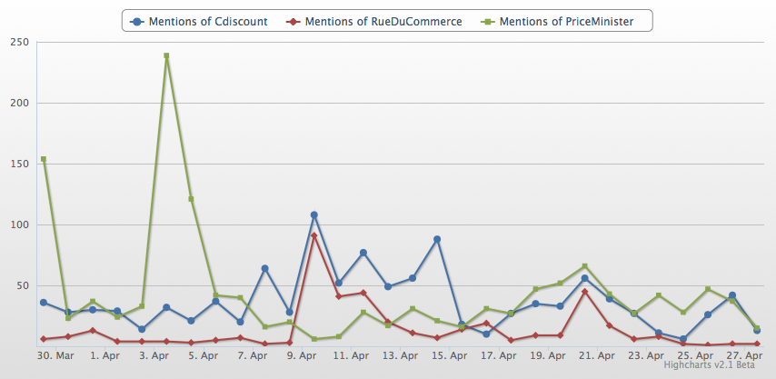 Comment obtenir cet indicateur : Topsy, le moteur de recherche en temps réel du web collaboratif, a mi à disposition des internautes un outil nommé Social Analytics il y a quelques mois. Il permet ainsi de connaître le nombre exact de mentions journalières pour des mots-clés donnés, mais surtout, de comparer cette progression (par exemple sur un mois, bien que ce soit trop juste) par rapport à vos concurrents. Collectez alors ces données et faites des comparaisons sur plusieurs trimestres !