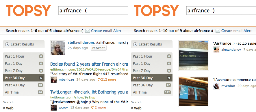 Comment obtenir cet indicateur : une nouvelle fois, faisons confiance à Topsy, mais cette fois-ci, optons pour le moteur de recherche et non uniquement son service Analytics. En faisant une recherche « votrenom : ( » et une autre « votrenom : ) » (sans les espaces), il vous est possible d’obtenir le nombre d’une partie des mentions négatives et positives sur une période donnée, par exemple sur 30 jours. De plus, il vous est possible de vous abonner à ces résultats afin de les obtenir directement dans votre agrégateur de flux !