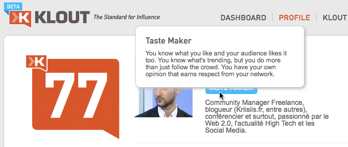 Comment obtenir cet indicateur : plusieurs outils sont en mesure de vous placer dans des catégories, je vous suggère cependant d’opter pour un service particulièrement sérieux et réputé, j’ai nommé le célèbre Klout. Il vous est possible, sur votre « Profil », de découvrir votre « Classification », basée sur des critères tels que votre écoute ou votre participation, votre partage ou votre création de contenu, votre précision, etc., d’autant plus que cette classification vous est présentée et expliquée en détails.