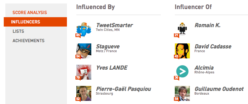 Comment obtenir cet indicateur : dans le cas présent, optons une nouvelle fois pour cet outil réputé qu’est Klout. Il vous permet, toujours sur votre « Profil », de découvrir les personnes que vous influencez. En accordant de l’intérêt à ces différents profils (idéalement dans le « New Klout », plus pertinent), il vous sera ainsi possible de découvrir si vous n’êtes pas en décalage avec votre objectif initial, et si les personnes que vous influencez le plus ont un pouvoir de persuasion important auprès de leur propre sphère sociale.