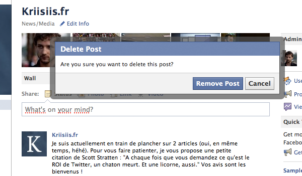J’espère sincèrement que ces quelques idées vous permettront de peaufiner votre activité et qu’elles vous permettront de ne pas faire d’erreurs sur votre Fan-Page Facebook. Si vous avez la moindre question ou la moindre suggestion à apporter au sujet de cet article, n’hésitez pas à m’en faire part dans les commentaires ci-dessous, sur la Fan-Page de Kriisiis.fr sur Facebook, ou encore sur Twitter (@Kriisiis). Quel est selon-vous le point le plus important, parmi cette sélection ?