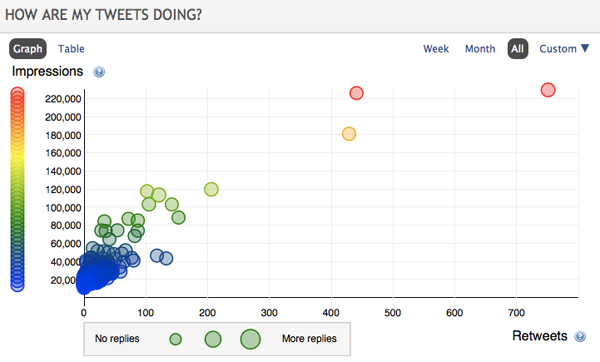 Crowdbooster met un certain nombre de fonctionnalités particulièrement pertinentes entre les mains des utilisateurs, à commencer par la vue d’ensemble de la performance de ses partages (sur une semaine, sur un mois, ou pour une période personnalisée), avec un positionnement « par nombre de retweets » (Twitter) ou « par nombre de Likes » (Facebook) et une taille dépendant du nombre d’impressions du contenu. Il est ainsi très simple de percevoir les publications qui ont le plus plu.