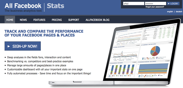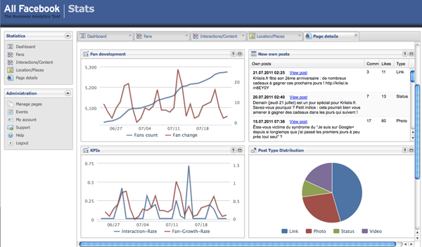 Notre premier partenaire se nomme AllFacebookStats.com ; si vous en avez déjà entendu parler, c’est certainement parce qu’il édite l’excellent blog AllFacebook.com. Cette société propose une solution Analytics permettant de tracker et de mesurer la performance de sa ou ses Fan-Pages Facebook, et ce à l’aide de nombreuses fonctionnalités très intéressantes. De nombreuses sociétés font confiance en la solution, notamment en Allemagne, à commencer par Audi, très active sur les médias sociaux depuis quelques années.
