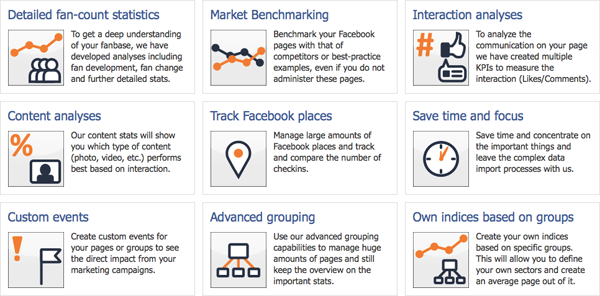 Cet outil propose des statistiques sur les membres de la communauté, une confrontation de sa performance avec celle de ses concurrents, une analyse des interactions et du contenu et donc une mise en avant de ce qui plait le plus aux internautes, un système de tracking pour les lieux Facebook, un gestionnaire de campagnes ou encore un système de groupement et de management de Fan-Pages sous forme de groupes. De quoi avoir une excellente vision de sa performance et de la manière de la peaufiner !