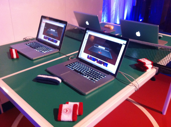 À quelques mètres de la gamme Nexus se trouvait une table de ping pong relativement originale, puisqu’accueillant 4 Macbook Pro, permettant à 4 visiteurs de faire une petite partie. Le concept de ce jeu est très simple : à l’aide de la webcam, chaque joueur fait bouger sa raquette derrière la table… en faisant de grands gestes avec sa tête ! Attention aux coups de tête ; jouer en public vous garantie quelques moments de solitude, mais on se prend très rapidement au jeu… SMASH !