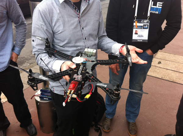Au moins de Décembre, il n’y a généralement pas grand monde dehors, surtout à #LeWeb12 (malgré le fait que comme chaque année, les trois grands espaces soient situés dans trois bâtiments distincts, espacés de quelques dizaines de mètres). Finalement, les deux seuls attroupements lors de cet événement ont été provoqués par l’arrivée de Fleur Pellerin (ministre déléguée chargée des PME, de l’Innovation et de l’Économie numérique), et… le test d’un drone télécommandé par la Team Blacksheep.