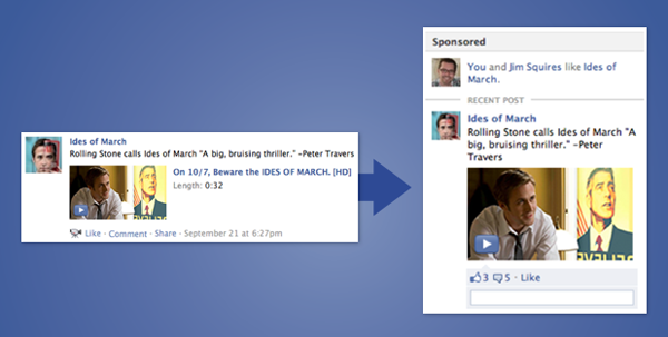 L’actualité sponsorisée est une ingénieuse invention de la part de Facebook : la mise en avant de l’interaction de l’un de vos amis, supposant qu’elle suscitera particulièrement votre intérêt par rapport à une publicité traditionnelle (le classique « Tiens, Matthieu aime cette page ? C’est sans doute intéressant »). À noter que l’actualité sponsorisée s’utilise en support d’une annonce traditionnelle ou d’une publication sponsorisée puisqu’elle se nourri des interactions générées initialement.