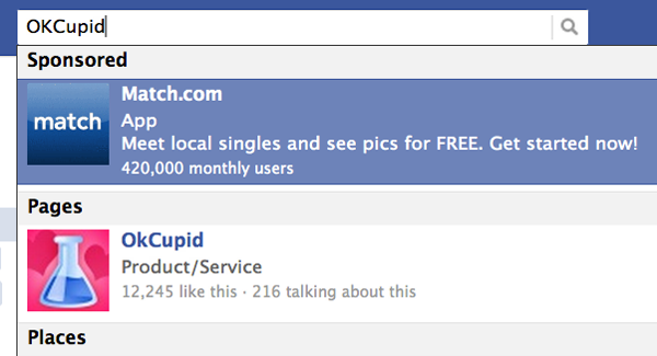 L’un des types d’annonces publicitaires qui font le moins de bruit est certainement le résultat sponsorisé : concrètement, cet encart vous permet de valoriser votre page ou votre application dans le moteur de recherche de Facebook (à la fois dans les suggestions lors de la rédaction d’un mot-clé et dans les résultats), et ainsi, par exemple, de faire un joli pied-de-nez à vos concurrents en valorisant votre présence avant la leur lors de la recherche d’un internaute.