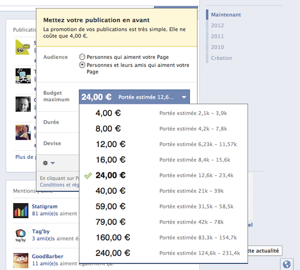Concrètement, un lien « Promouvoir » situé en bas à droite des publications permet de définir une audience (fans ou fans et amis de fans) et un budget maximum (avec 6 suggestions en terme de portée estimée, en fonction de la portée potentielle). Si la durée de la promotion (3 jours) n’est pas personnalisable, il vous est toujours possible de changer la devise si besoin (49 au choix). À noter que seules les pages de plus de 100 fans et seules les publications datant de Juin 2012 et plus sont admissibles.