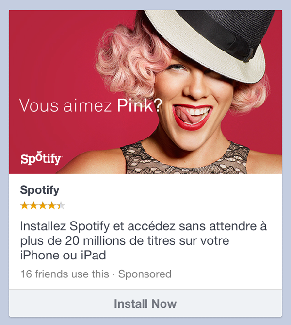 Vous naviguez sur Facebook par le biais de votre smartphone iOS ou Android ? Alors vous n’avez pas pu rater les fameuses publicités vous invitant à télécharger une application ! Cet encart, qui permet aux développeurs de valoriser leur app auprès d’internautes sur l’OS adéquat, semble bien fonctionner : la société Miso souligne par exemple avoir enregistré un CPC de 0.45$, un taux de conversion de 26% (installations) pour un coût final par utilisateur de 1.73$.