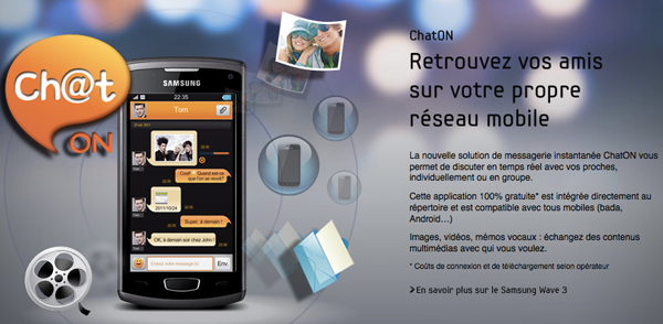 J’ai donc décidé de m’associer une nouvelle fois à Samsung afin de vous présenter leur nouvelle solution de messagerie instantanée ChatON ainsi que leur site ChatON Studio, et de vous faire gagner un smartphone, à savoir le Samsung Wave 3 ! De la même manière qu’en Novembre 2011, vous aurez deux façons de participer au concours : relayer ce billet sur Twitter (je comptabilise également les retweets) ou publier un commentaire m’expliquant ce que vous pensez de ChatON et/ou de ChatON Studio.
