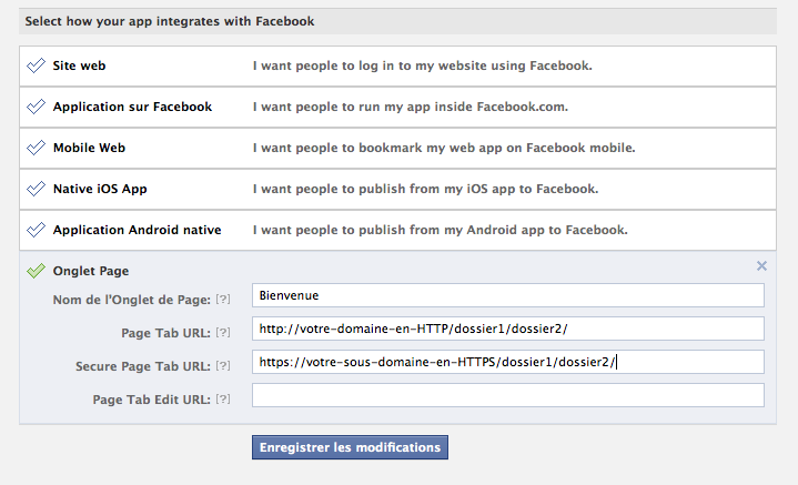 Passons à l’étape la plus importante, celle du renseignement du contenu à afficher à travers l’application. Cliquez sur « Onglet Page », renseignez le « Nom de l’Onglet » (celui qui s’affichera dans la liste des onglets sur la Fan-Page, par exemple « Bienvenue »), et ajoutez le chemin des deux documents, « http://…/ » pour « Page Tab URL » et « https://…/ » pour « Secure Page Tab URL », sans préciser le nom du document (ici « index.html ») à la fin du chemin (sinon ça ne fonctionnera pas).