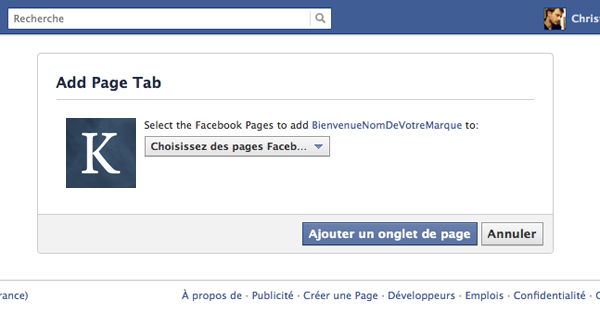 Maintenant, renseignez les deux éléments à personnaliser. A la place de « YOUR_URL », renseignez le chemin HTTP de votre contenu (le fameux « http://…/ »), et à la place de « YOUR_APP_ID », l’ID de votre application (précisée en haut de la page de personnalisation de votre application, sous son nom). Accédez à cette adresse (cliquez sur « entrer »), vous n’avez alors plus qu’à sélectionner la page sur laquelle vous souhaitez ajouter l’application et à cliquer sur « Ajouter un onglet de page » !