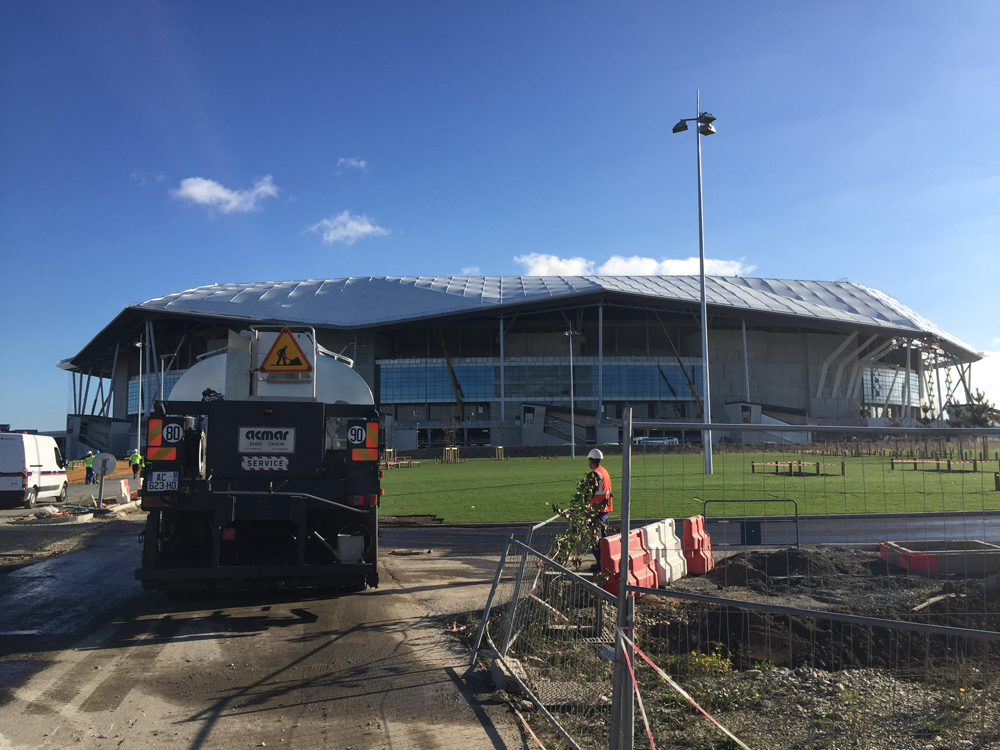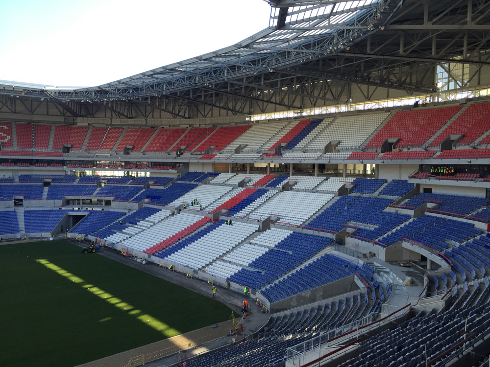 Mardi 10 novembre, à peine remis de l’adrénaline accumulée pendant le derby de l’avant-veille, j’ai eu l’occasion de faire quelque chose que j’attends depuis longtemps : visiter le futur Grand Stade de l’OL. Il faut dire qu’avec de la famille à Décines, commune accueillant ce géant ayant nécessité l’équivalent de tout le béton coulé pendant un an dans l’agglomération lyonnaise et dont la charpente fait le poids de la Tour Eiffel (400.000 boulons compris), j’ai souvent l’occasion de passer devant, et donc de suivre la progression des travaux qui ont débuté il y a « seulement » 29 mois. Et le résultat est, très honnêtement, à la hauteur de mes espérances : le Grand Stade, dont l’architecte est le même que pour l’Emirates Stadium d’Arsenal en Angleterre, est un « stade à l’anglaise », bluffant par sa taille, son design, son agencement, et surtout, par sa capacité à ne pas présenter le moindre poteau à l’intérieur –si ce n’est ceux des buts– afin de s’assurer que jamais, ô grand jamais, un spectateur ne sera gêné par un élément dérangeant dans son champ de vision.