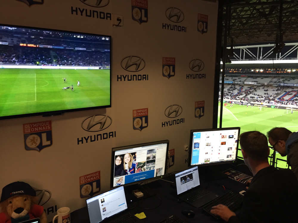 Dimanche 8 novembre, j’ai eu la chance de pouvoir découvrir la fameuse SociOLroom by Hyundai, un quartier général dédié à la gestion des réseaux sociaux à l’occasion des gros matchs, et cette fois-ci en l’occurrence, à l’occasion du magnifique derby Lyon / Saint-Etienne (3-0), dans une ambiance extraordinaire (le joueur Rafael, pourtant habitué aux plus grosses ambiances, a d’ailleurs dit que c’était « comme un Manchester-Liverpool »). La SociOLroom, c’est une loge dédiée aux espaces conversationnels, remplie d’écrans et de passionnés faisant le boulot de leurs rêves, et chargés notamment de capitaliser sur les discussions liées à l’événement (le hashtag #OLASSE a notamment été mentionné à 80.000 reprises) sur la base de la communauté OL, rassemblant notamment 2,3 millions d’internautes sur Facebook, 804.000 sur Twitter, ou encore 113.000 sur Instagram. Voir défiler les conversations autour d’actions-clés est tout bonnement surréaliste, et nécessite sans doute un bon entrainement chez les community managers !