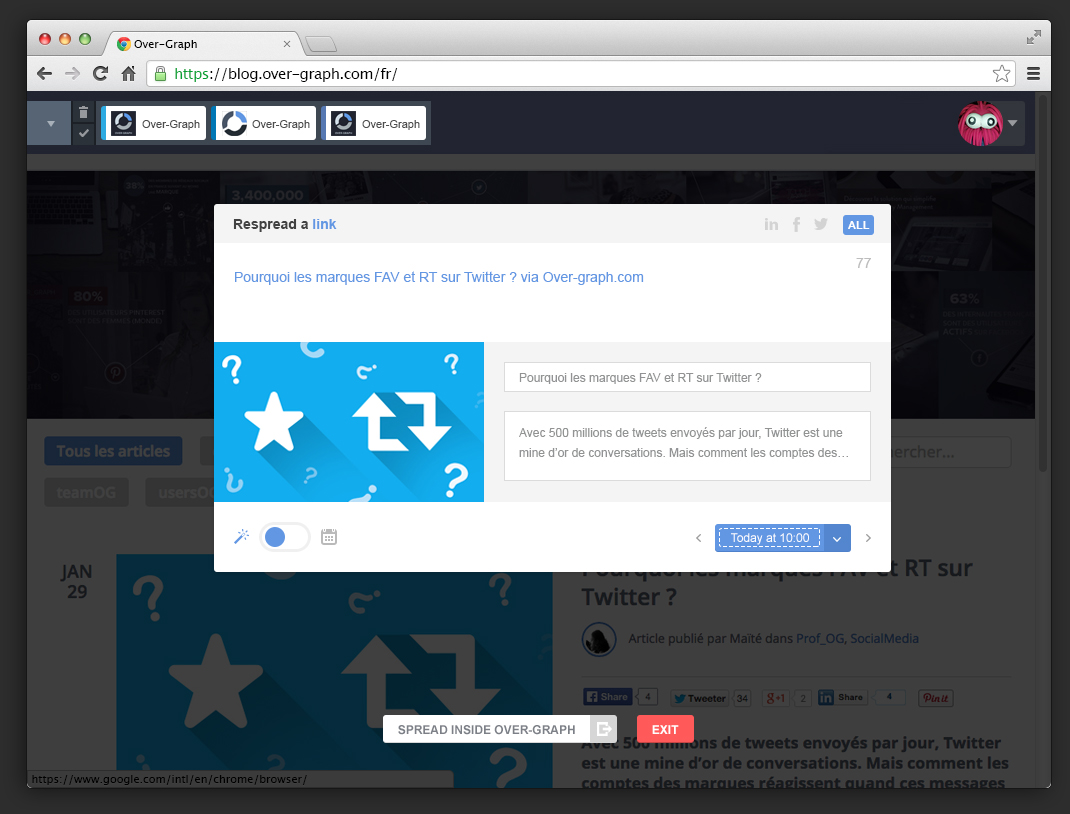 L’extension est actuellement disponible pour Facebook, Twitter et LinkedIn. Il suffit de cliquer sur l’icône Over-Graph et votre contenu est prêt à être partagé et façonné en fonction de vos objectifs !