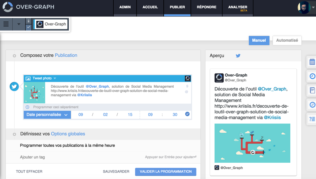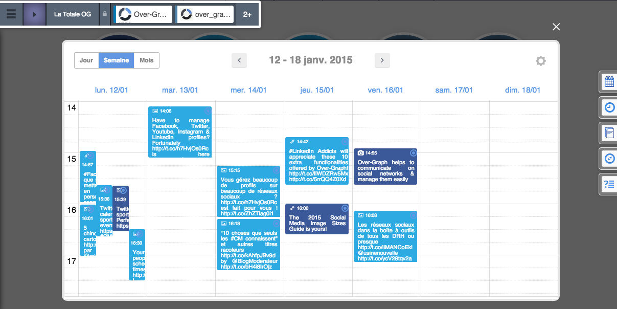 Ce serait limiter Over-Graph à une seule fonctionnalité, et c’est bien dommage…car l’outil s’est doté de quelques atouts supplémentaires qui facilitent le travail du community manager dans la gestion de ses publications à la fois sur Facebook, Twitter, YouTube, Instagram et LinkedIn. Cet outil multi-réseaux sera bientôt l’un des plus complets sur le marché puisqu’il proposera aussi dans quelques semaines la gestion des réseaux Pinterest et Google +.