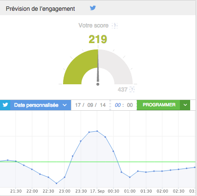 Et c’est là que l’utilisation d’Over-Graph prend tout son sens pour le CM averti : au moment de programmer vos publications sur Facebook et Twitter, le score d’engagement vous aide à choisir le meilleur moment pour poster vos contenus selon la plateforme choisie. Établi de 0 à un score maximal qui varie en fonction des semaines et des types de publications choisies, il varie également d’un utilisateur à l’autre. Les scores proposés évoluent chaque semaine et deviennent de plus en plus précis. Ils donnent un indicateur nouveau et chiffré dans les outils de programmation social media et même dans les fonctionnalités analytiques de ceux-ci !