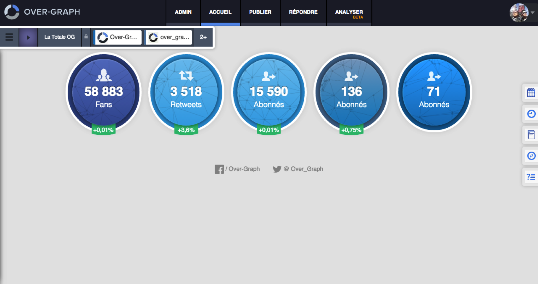 Pour finir, notez que le plus gros point fort de la plateforme est certainement sa capacité à évoluer. Des fonctionnalités sont ajoutées de manière régulière, et un nouveau réseau social est ajouté tous les 3 mois environ. D’ailleurs, l’équipe d’Over-Graph hésite pour le prochain : Google+ ou Pinterest ? Quelle serait votre préférence ?