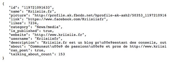 Prenez l’URL de votre Fan-Page (https://www.facebook.com/Kriisiisfr, dans mon cas) en vous assurant qu’il ne s’agit pas d’un onglet spécifique. Dans cette URL, remplacez « www » par « graph » (https://graph.facebook.com/Kriisiisfr), et appuyez sur entrée : vous allez alors être redirigé vers une page blanche détaillant brièvement votre Fan-Page, et au sein de laquelle la première ligne indique un « id : » ; copiez la série de chiffres, car il s’agit de l’identifiant de votre page.