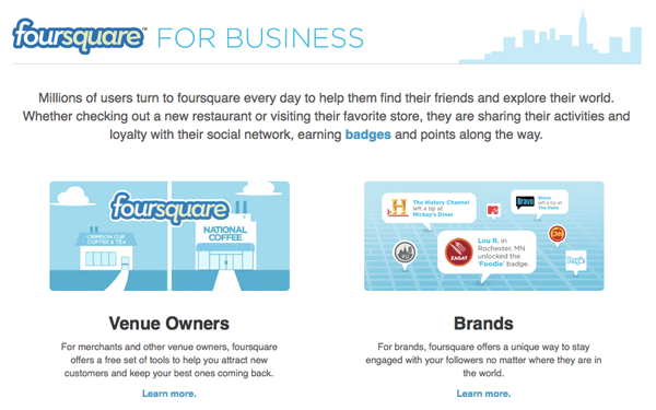 Dans la description ci-dessous, nous diviserons « Foursquare for Business » en deux parties. La première, en trois points, présente la solution destinée aux gérants de services géolocalisables et à tous les consommateurs à la recherche de réductions dans leurs magasins ou commerces favoris. La seconde, en trois points également, présente la solution destinée cette fois-ci aux marques non-géolocalisables ainsi qu’à tous les utilisateurs de Foursquare à la recherche de conseils « géolocalisés » de leur part.