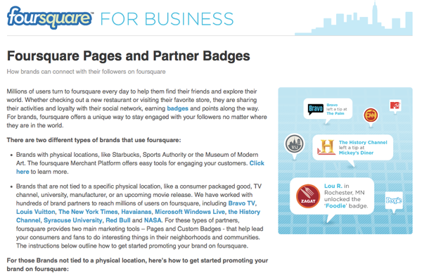 Passons maintenant à ce qui nous intéresse le plus, c’est à dire la partie destinée aux marques en général, puisqu’elle permet à toute entreprise de créer sa Foursquare Page (un équivalent de Fan-Page Facebook mais ne permettant pas d’échanges avec les consommateurs). Pour créer votre propre page, il vous faudra remplir ce formulaire et le renvoyer à Foursquare par email, en attendant qu’une plateforme de création automatique soit disponible (elle a officiellement été annoncée par Foursquare).