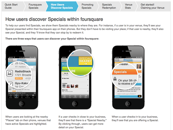 Lorsque vous avez revendiqué un lieu, la seconde étape consiste en la création de « Specials », c’est à dire des coupons, réductions ou offres promotionnelles qui pourront être débloqués selon certaines conditions que vous êtes libre de définir. Les consommateurs pourront alors les découvrir de 3 façons : d’abord, en regardant les lieux à proximité sur Foursquare (« Specials à proximité »), ensuite, en faisant un checkin à proximité, enfin, en faisant un checkin sur place (« Specials here »).