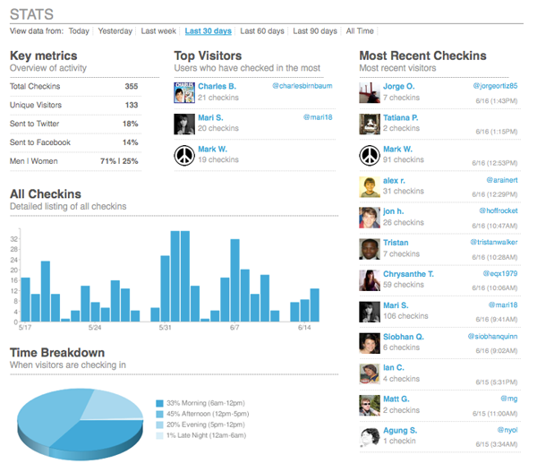 La plateforme Analytics donne des informations telles que le nombre de checkins journaliers dans votre lieu, le visiteur le plus récent, le visiteur qui s’est présenté le plus grand nombre de fois sur ce lieu, la distinction « première visite ou non » pour le nombre total de checkins, la répartition selon le sexe des consommateurs, la répartition « horaire » des checkins tout au long de la journée, ou encore, le % de checkins qui ont également été partagés sur les réseaux sociaux Facebook et Twitter.