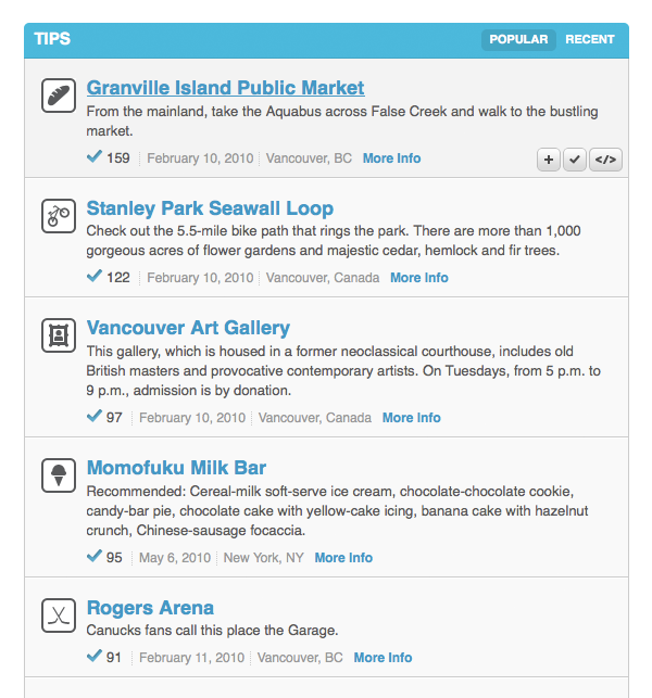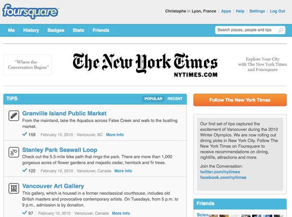 Prenons par exemple la Foursquare Page du NY Times. Elle se divise en 4 blocs. Le premier est donc le header (Logo et phrase d’accroche « Explore your city with the New York Times and Foursquare »), le second concerne les Tips, pouvant être classés par date ou par popularité, le troisième est un bloc de description (ici 42 mots) auquel sont associés des liens vers les comptes Twitter et Facebook, le quatrième présente un rapide aperçu des abonnés (plus de 50.000 au total).