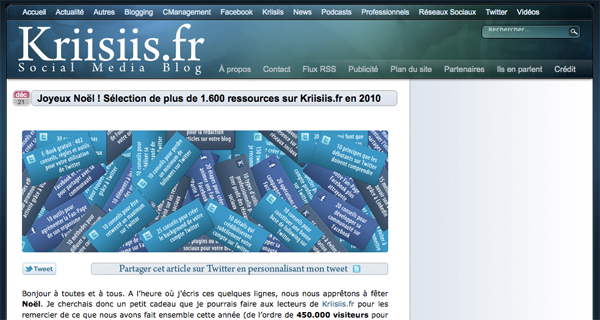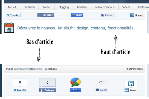 Kriisiis.fr était jusqu’à maintenant le mauvais élève des partages sociaux, non pas par manque de boutons sociaux (au contraire), mais tout simplement parce qu’ils étaient placés aléatoirement sur le blog, très peu optimisés, et ne fonctionnant parfois même pas. Nous avons désormais une barre de partage compacte en haut d’article, une barre de partage complète en bas, et cerise sur le gâteau, les nouveaux boutons LinkedIn vous sont proposés, ce qui vous permettra alors de conseiller les articles du blog auprès de votre sphère sociale professionnelle. Vous n’avez plus d’excuses !